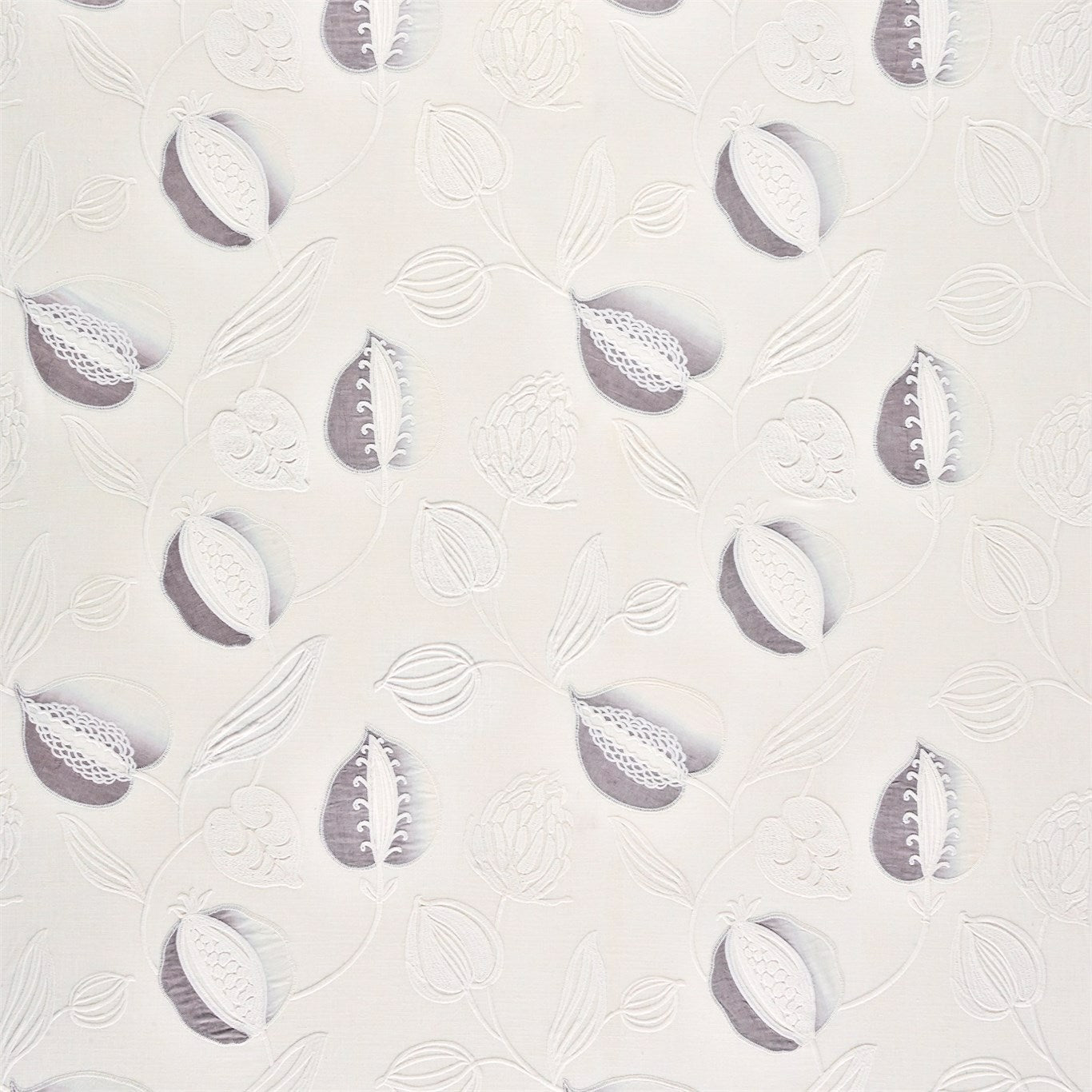Purity Fabrics - Abella. A calming fabric design with just a subtle suggestion of colour. The popular Tembok motif has been appliqued with a spray-dyed voile and outlined in white cotton thread. Produced in gentle colourways for blinds and curtains in calm schemes.