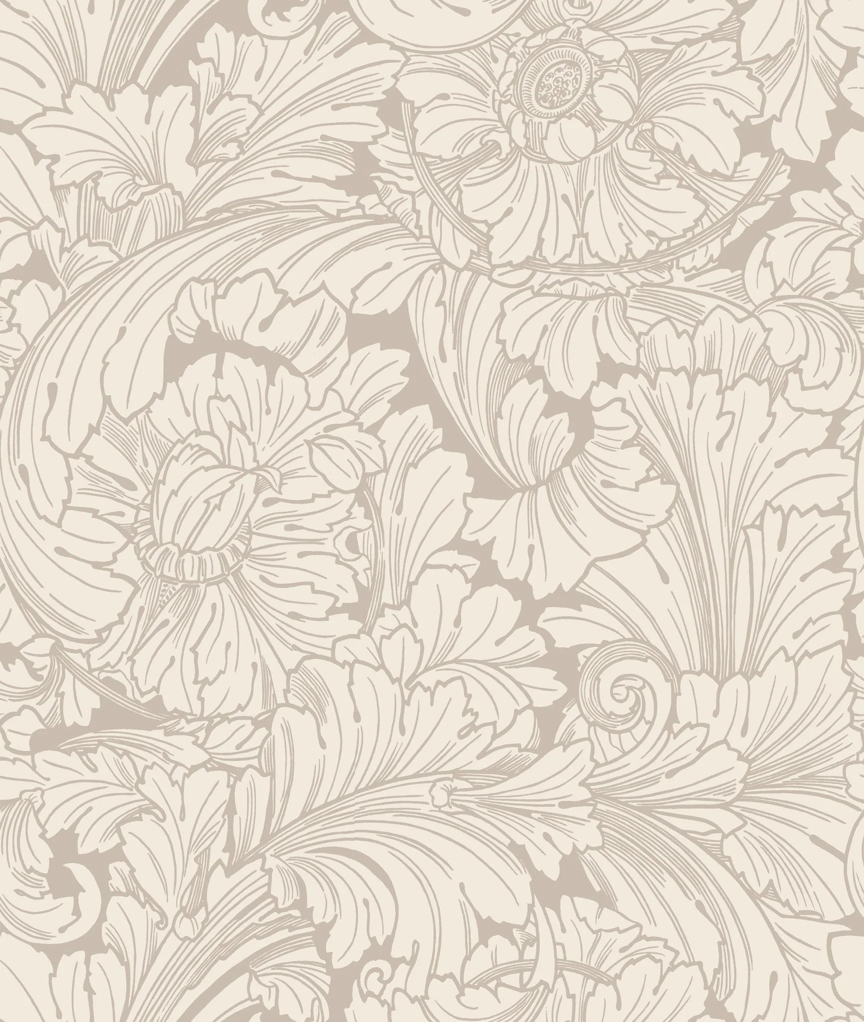 The graphic linework of Acanthus‚ stylised filigree-like flowers and foliage makes this archival Arts and Crafts design feel at once classic and contemporary. The perennial‚ large leaves give an opulence to this vegetal print with its stately colour palettes of soft Pebble grey and Print Room Blue, alongside earthy Forest greens, and striking monochromatic Soot, Snow, and rouge