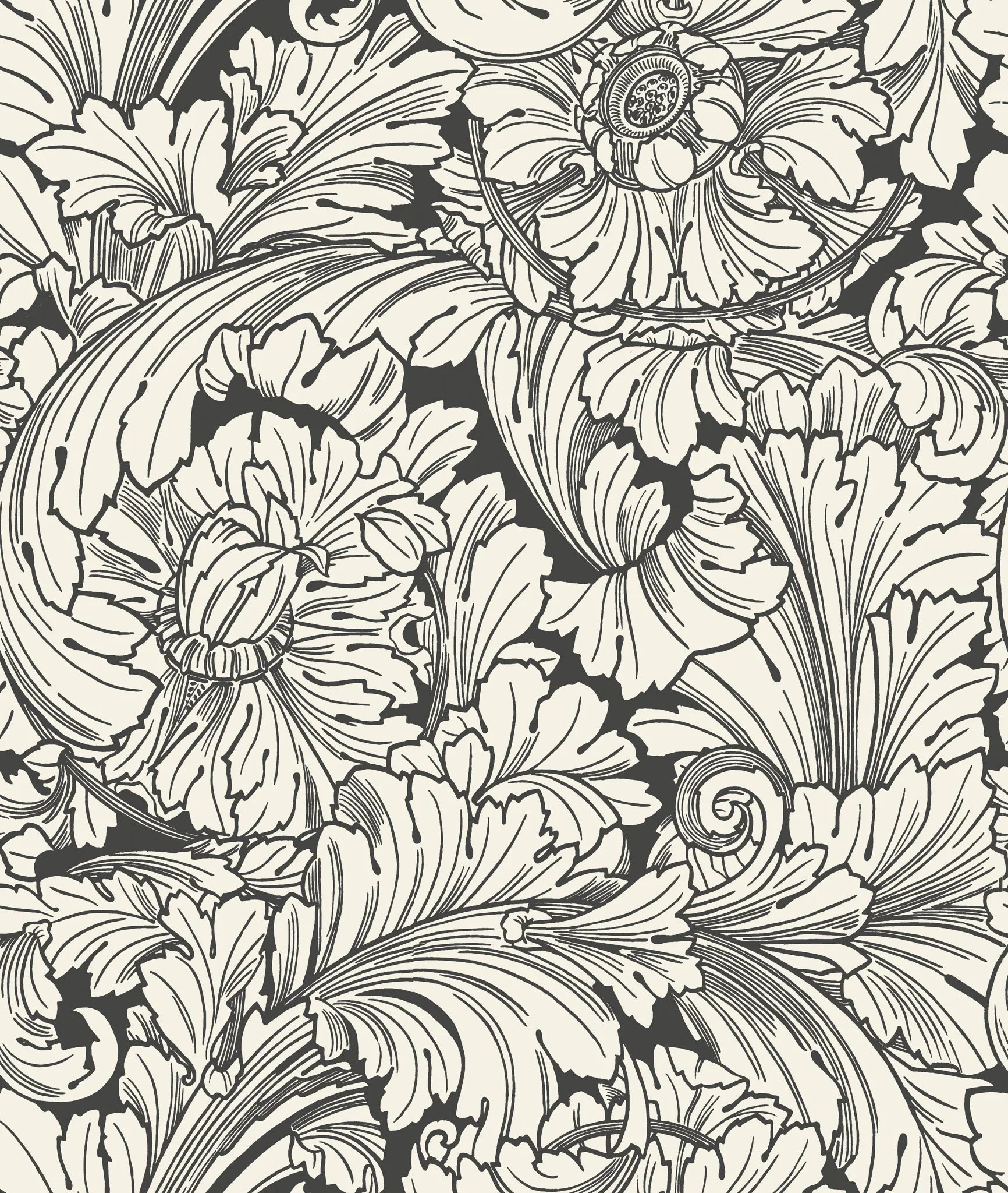 The graphic linework of Acanthus, stylised filigree-like flowers and foliage makes this archival Arts and Crafts design feel at once classic and contemporary. The perennial‚ large leaves give an opulence to this vegetal print with its stately colour palettes of soft Pebble grey and Print Room Blue, alongside earthy Forest greens, and striking monochromatic Soot, Snow, and rouge.