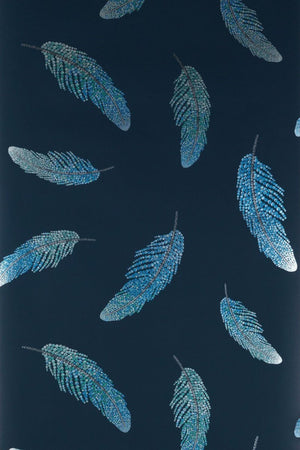 Adornado by Matthew Williamson brings a touch of opulent whimsy to your interiors, presenting an exquisite navy backdrop graced with intricately patterned feathers. The delicate plumes shimmer with a mosaic of jewel-like blues and turquoises, each bead catching the light to create a serene glittering effect. This sophisticated design, rich in detail and colour, promises to transform any space into a haven of chic tranquillity.