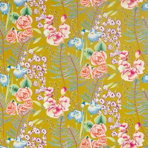 Zapara Fabrics - Amaryllis. A cotton fabric with a satin sheen depicting a profusion of flora and fauna bursting with colour. A glamourous choice for upholstering statement furniture pieces.