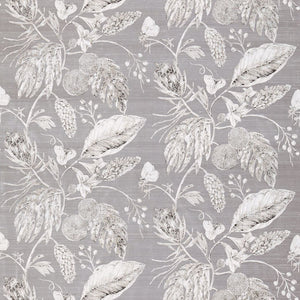 Palmetto Fabrics - Amborella Silk. A botanical vintage-style silk fabric design featuring delicately drawn butterflies, pinecones and exotic flowers. Elegant for blinds and drapes.