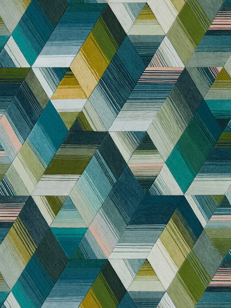 Immerse your space in the geometric charm of the Arccos wallpaper by Harlequin. This design features a dynamic array of diamonds in a sophisticated colourway, with hues of teal, aquamarine, and muted gold, alongside subtle shades of grey and green. Each diamond showcases textured detailing, presenting a layered effect that adds depth and interest to the pattern. Perfect for creating a contemporary focal point, this wallpaper promises to infuse any room with a dash of modern elegance.