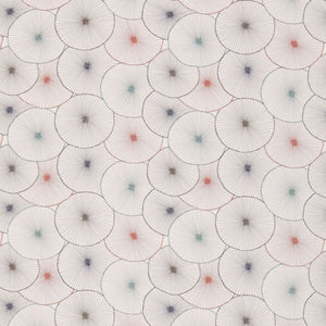 Palmetto Fabrics - Aster. Large overlapping circles, akin to oriental seedpods, are embroidered onto a silk-effect fabric. A gentle way to introduce a hint of colour to a room.