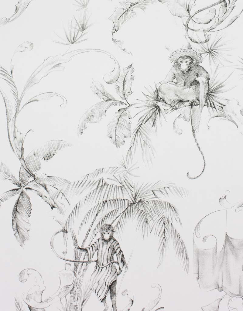 Immerse your space in the whimsical charm of the Barbary Toile wallpaper by Nina Campbell. This enchanting design features a refined monochromatic palette, with intricate illustrations of monkeys amidst tropical flora on a crisp white backdrop. The playful primates are delightfully attired in period clothing, adding a touch of unexpected sophistication. Perfect for adding a dash of character to any room, this wallpaper marries classic elegance with a touch of the exotic.
