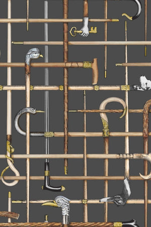 Adorn your space with the whimsical charm of the Bastoni wallpaper by Cole & Son, showcasing a nuanced grey background interlaced with a lattice of bamboo canes. This playful design boasts an eclectic array of graphic walking sticks, each illustrated with astonishing detail, infusing a traditional object with a touch of contemporary elegance. The occasional presence of a bird or clasped hand adds an element of surprise, making each glance a new discovery. A delightful intersection of the natural and fanciful, this wallpaper promises to enliven any room with its unexpected visual narrative and muted, sophisticated colourway.