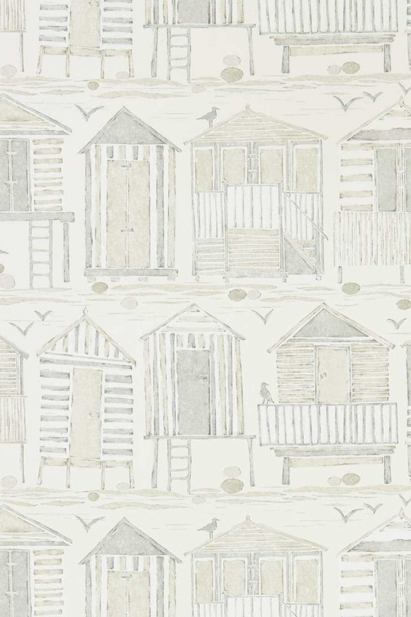 Immerse your space in the serene coastal charm of the Beach Huts wallpaper by Sanderson. This design features a delightful array of beach huts, each presented in soft, neutral tones on a crisp, off-white background. The hand-drawn aesthetic gives a bespoke and whimsical feel to the wallpaper, imbued with subtle greys and hints of beige that create a tranquil, airy atmosphere. Pebbles and seashells are interspersed with occasional seabirds, lending an authentic touch of the seaside to any room.