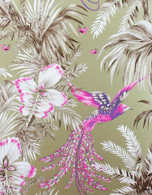 Immerse your space in the tropical splendour of the Bird Of Paradise wallpaper by Matthew Williamson. This elegant design features vibrant pink birds in mid-flight amidst an array of taupe and white botanical motifs, set against a soft olive backdrop. The interplay of lush palms and exotic avian creatures produces a dynamic yet sophisticated ambience, perfect for adding a touch of whimsy to both contemporary and traditional interiors. Indulge in this captivating blend of nature and luxury to create a serene escape within your home.