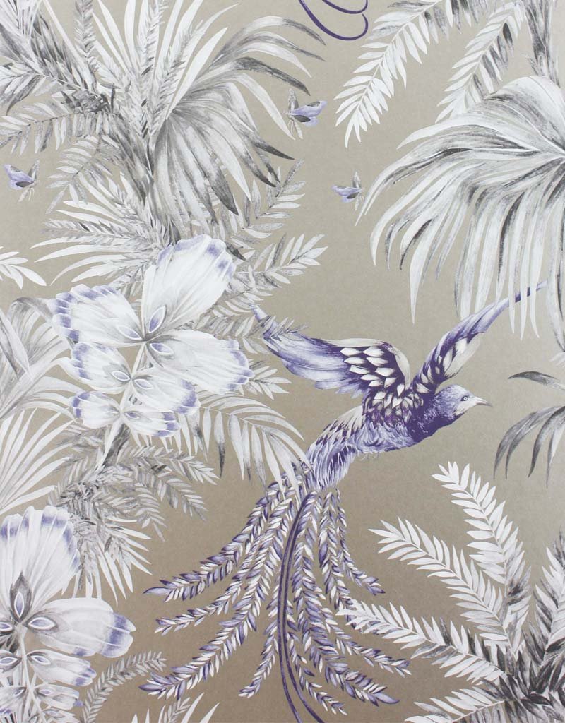 Immerse yourself in the exotic elegance of the Bird Of Paradise wallpaper by Matthew Williamson. This exquisite design showcases a lavish display of tropical florals and delicate birds in a sophisticated mélange of purple, white, and muted greys set against a stylish taupe background. Perfect for creating a serene escape in your home, the intricate detailing and luxurious colourway add a touch of opulence to any room, making for a timeless interior statement.