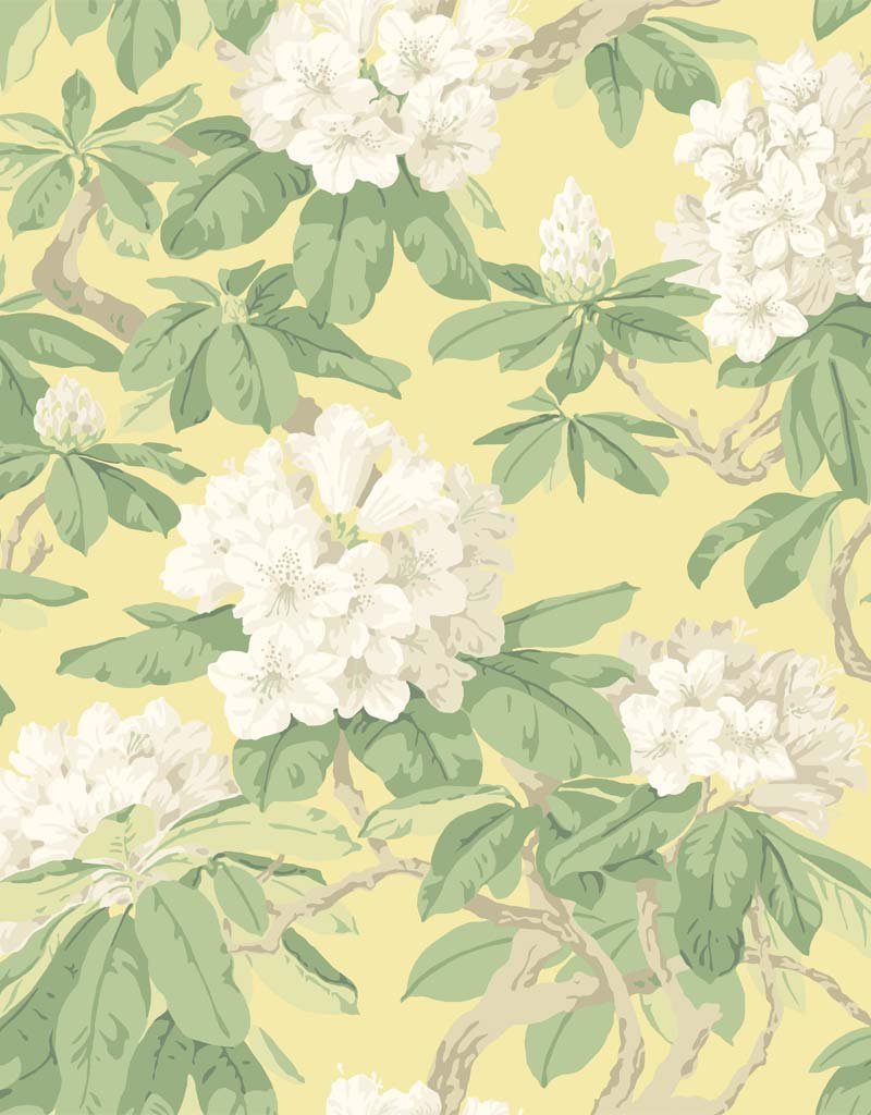 Elevate your walls into a blossoming garden with the Bourlie wallpaper by Cole and Son. Presented in a charmingly soft, pastel palette, the design showcases a profusion of rhododendrons set against a gentle yellow backdrop. The naturalistic portrayal of the foliage and florals adds an enchanting depth and texture, turning any room into a serene retreat. This wallpaper's soothing hues and detailed botanical print are perfect for creating a tranquil and inviting space.