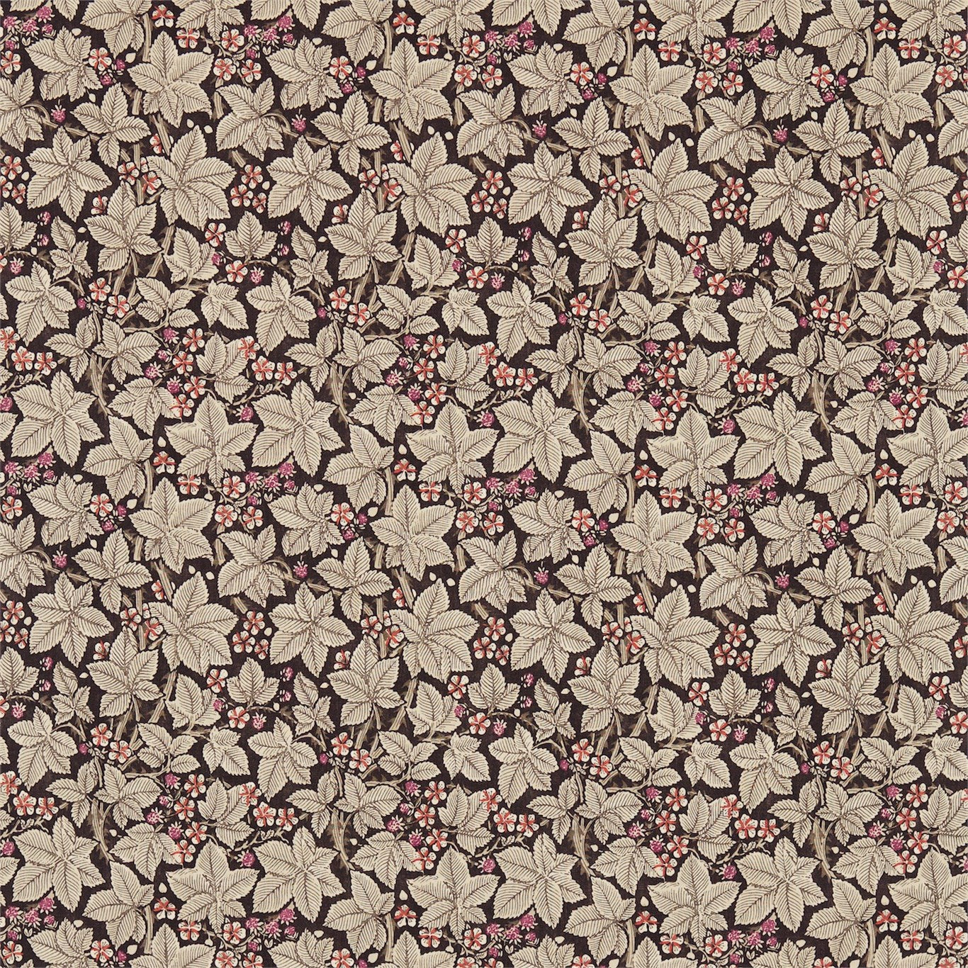 A stylised pattern of blackberry briars with berries and white flowers cover this upholstery fabric, designed in 1879 by Kate Faulkner - a talented sister of one of the partners of Morris & Co. Available as both a fabric and wide width wallpaper, this fabric design is produced in dramatic colourways.