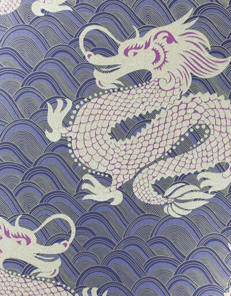 Imbue your space with the mystique of the Orient with the exquisite Celestial Dragon wallpaper by Matthew Williamson. This majestic design features a sinuous dragon meandering amongst rolling waves, all cast in a striking purple and silver colourway. The lustrous sheen of the paper adds a touch of irresistible elegance, while the intricate detailing ensures a wallpaper that's as textured and tactile as it is visually compelling. A perfect fusion of traditional symbolism and contemporary chic.