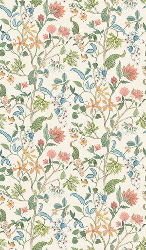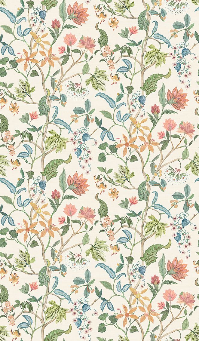 inspired by Indian Mughal style, a floral trail of tiger lilies and exotic flowers weaves around a central meandering stem. Printed on linen. Named after the Chellah Gardens located in Rabat, Morocco.