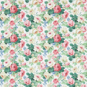 Adorn your space with the timeless charm of the Chelsea wallpaper by Sanderson. This design's delightful colourway features an array of blush pinks, soft corals, and creamy whites with touches of gentle blue, conjuring a refreshing bouquet of English roses in full bloom. Set against a tranquil ivory backdrop, the wallpaper exudes a serene yet cheerful atmosphere. Its classic floral motif brings a nostalgic grace to any room, making it a perfect choice for creating a cosy and elegant interior.
