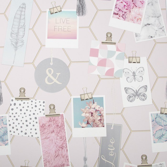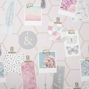 Adorn your walls with the whimsical charm of the Clip Frames Pink wallpaper by Fresco. This delightful design features a soft pink colourway, interwoven with gentle greys and crisp whites, creating a modern yet playful atmosphere. The wallpaper uniquely captures the essence of a personal pinboard with varied images and motifs, clipped upon a geometric honeycomb pattern. The eclectic mix of feathers, botanicals, and inspirational quotes adds a touch of creativity, ideal for adding personality to any room.