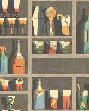 Infuse your space with the sophisticated allure of the Cocktails wallpaper by Cole & Son. This whimsical design showcases a muted colourway with earthy tones, featuring a collection of illustrated bottles, glasses, and cocktail-making accessories neatly arranged on shelves. The muted grey backdrop is accented with hints of terracotta, navy, ochre, and subtle greens, lending a vintage yet timeless charm to any room. The illustrative style exudes a playful yet elegant vibe, perfect for creating a captivating feature wall in a dining area or a spirited conversation piece in your home bar.
