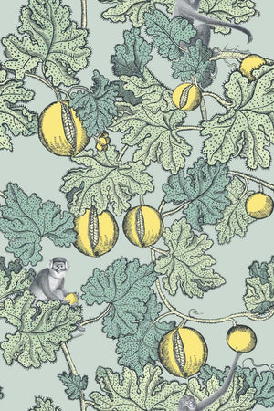 Adorn your walls with the Cole and Son Frutto Proibito Wallpaper, a striking infusion of whimsy and colour. This delightful print features a pale teal backdrop delicately festooned with intricate foliage and ripe, golden-yellow fruits that gently juxtapose the muted tones. Mischievous grey monkeys, finely detailed, playfully harvest and hoard the luscious bounty, adding a touch of the exotic. A dash of fantasy, this wallpaper is sure to enliven any interior with its charming narrative and elegant design.