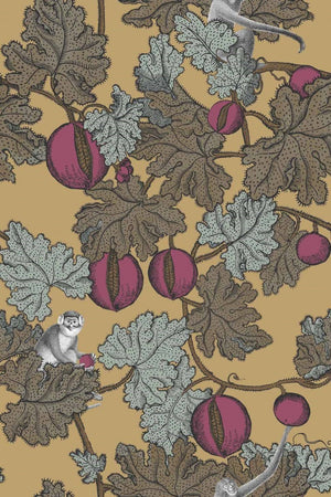 Adorn your walls with the enchanting scenes of the Cole and Son Frutto Proibito Wallpaper, a true celebration of whimsy and nature. Illustrated with a charming mustard colourway background, it features detailed renditions of foliage and playful monkeys nestled amongst vibrant plum-coloured fruits. This exquisite design effortlessly merges vintage charm with a touch of the exotic, perfect for creating an intriguing focal point in any room that seeks to captivate and inspire.