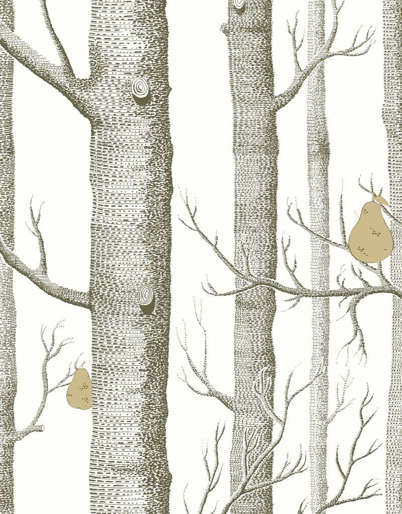 Indulge in the timeless elegance of Cole & Son Woods And Pears Wallpaper, adorning your space with a serene colourway of subdued whites and muted earth tones. This whimsical design captures a sylvan scene with slender trees and sporadic, whimsical pears, introducing a touch of nature's tranquillity. The textural detailing on the bark contrasts with the smooth, rounded pears, resulting in a sophisticated yet playful ambience suitable for a variety of interiors.