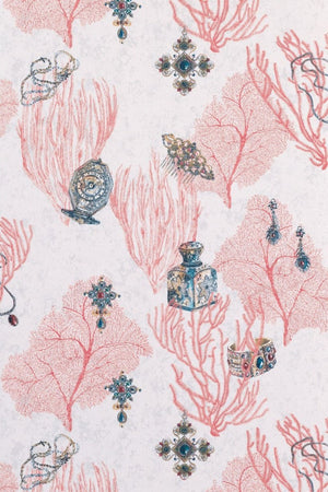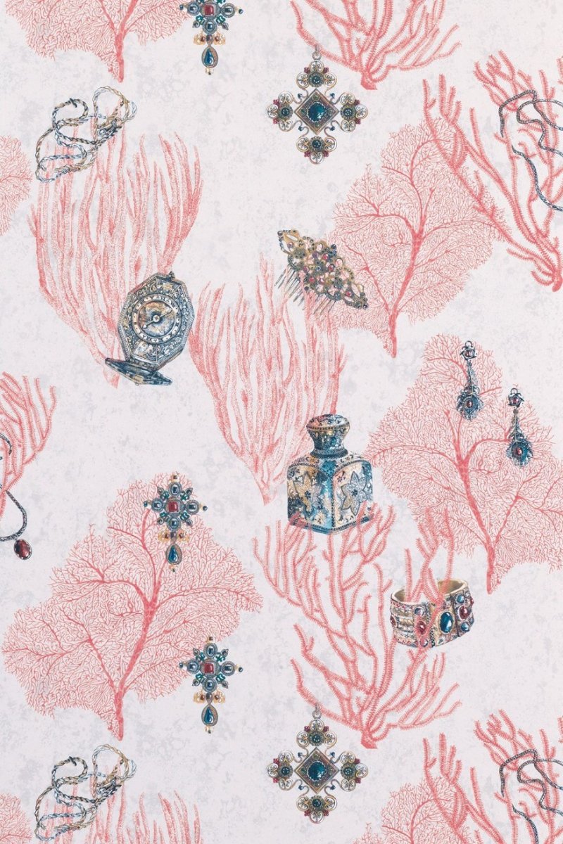 The Coralino wallpaper by Matthew Williamson delivers a whimsical yet sophisticated aesthetic, perfect for accentuating the charm of any room. It presents a delicate coral colourway, intertwined with an assortment of maritime-inspired illustrations. Jewellery pieces, detailed with intricate patterns and shimmering jewels, lie scattered amongst the coral structures, evoking a sense of underwater treasure and opulence. This exquisite design is set against a textured off-white background that enhances the vibrant coral hues and adds depth to the space it inhabits.
