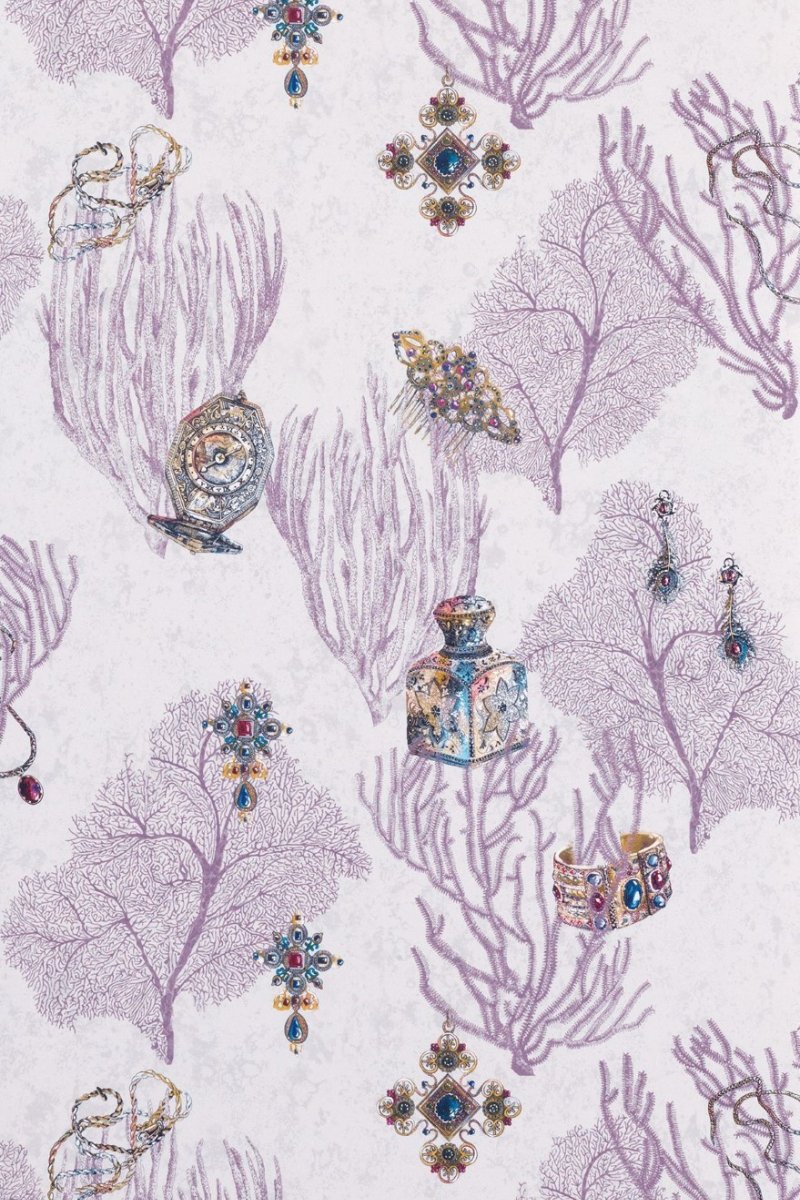 Immerse yourself in the enchanting underwater realm of the Coralino wallpaper by Matthew Williamson, where whimsical sea-inspired elements blend seamlessly with sophisticated design. The wallpaper features delicate shades of lavender and amethyst, set against a textured off-white background, evoking the beauty of coral beds. Adorned with intricate, jewel-like motifs that mimic the treasures of the deep, this wallpaper adds a touch of opulence to any room, inviting the allure of the ocean into your home.