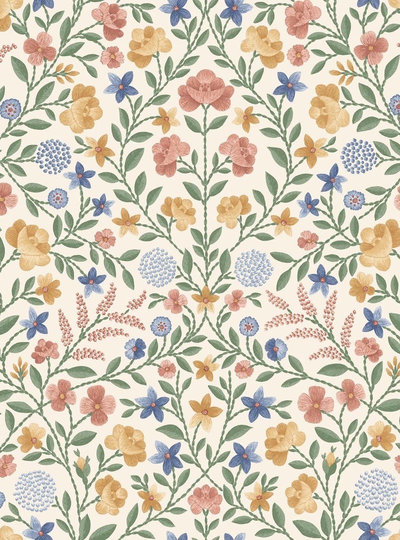 Embrace the timeless elegance of the Court Embroidery wallpaper by Cole & Son, showcasing a charming, pastel colourway. Its intricate botanical patterns are reminiscent of stately English gardens, featuring an array of soft mustard, blush pink, and periwinkle blue flowers intertwined with lush green foliage. This sophisticated design promises to add a touch of classical grace and an inviting ambiance to any room with its subtle shades and delicately detailed embroidery-like texture.