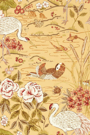 Immerse yourself in a whimsical world with the Crane & Frog Wallpaper by Sanderson. This enchanting design features an elegant amber backdrop adorned with intricate flourishes of flora and fauna. Stately cranes stand amid blushing blooms, while playful frogs and fluttering birds bring a dynamic sense of life to the scene. The traditional colourway, combined with the delicate detailing, captures a timeless aesthetic that will breathe a touch of sophistication into any space.