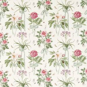 An original design, Etchings & Roses, has been elegantly repainted and coloured in a botanical illustration style. Featuring rare and beautifully engraved prints from Mulhouse, faithfully reproduced and including miniature insects scattered throughout the design, Cupid`s Beau is elevated to the next level of contemporary design with Giles`s illustrative bows and calligraphy, including his signature `G`. Each colourway creates an enchanting contrast between botanical and background, the antique origins of the print are maintained while also made sublimely new. Printed on a linen union for upholstery use.