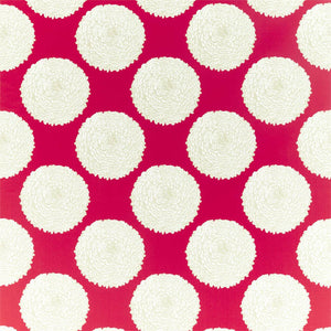 On a soft satin ground, printed Pompom dahlias bloom confidently. The Tulip and Cayenne colourways display an accent detail of intricate shimmering gold.