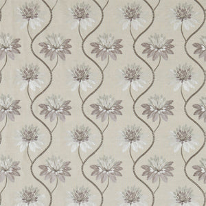 Purity Fabrics - Eloise. This rope-effect trailing fabric design is adorned with open flowerheads embroidered and then cut by hand to add fray` and texture. Coloured petals offset with hints of metallics stand out against the linen ground, making this fabric ideal for blinds and curtains in formal living spaces. A wallpaper of the same name is also available.