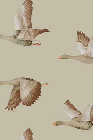 Infuse your space with the serene beauty of the Elysian Geese wallpaper by Sanderson. This elegant design features a flock of geese in mid-flight against a soothing sage-green background. The realistic depiction of these majestic birds showcases a harmonious colour palette of creams, beiges, and browns with subtle orange beak accents. Perfect for creating a tranquil ambience, this wallpaper is a testament to nature's simple grace and the artistry of timeless design.