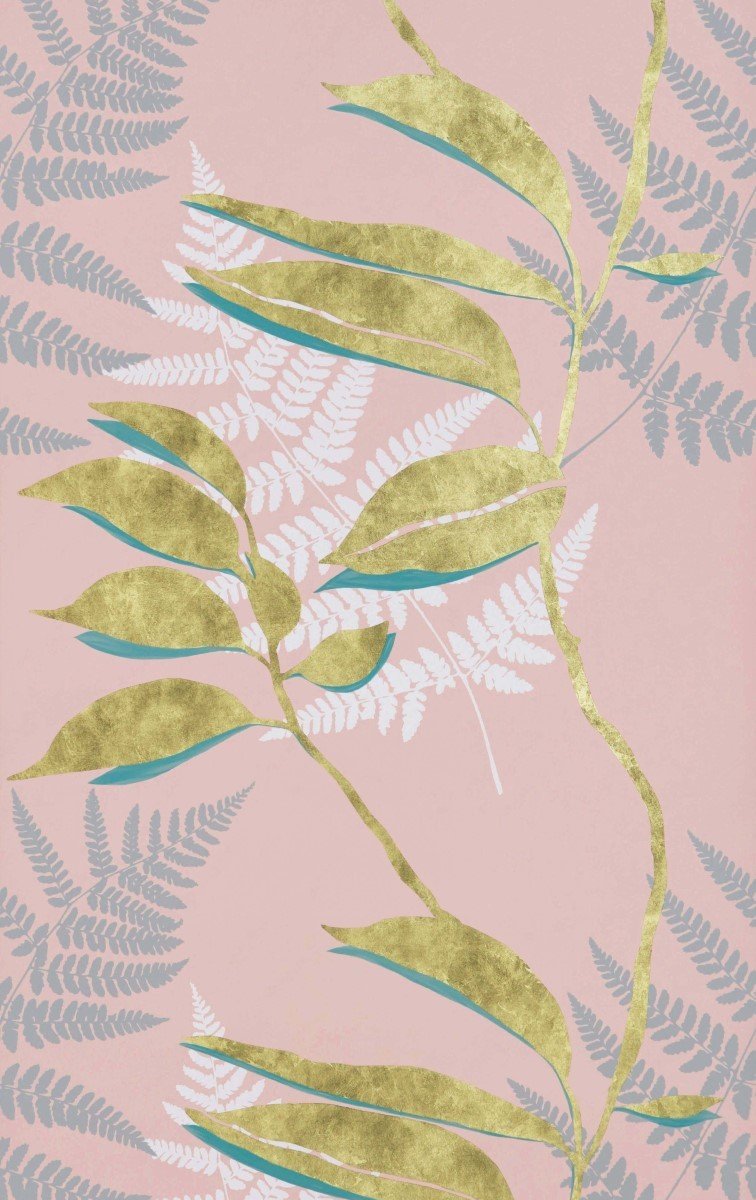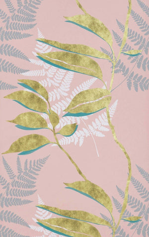 Immerse your walls in the serene beauty of the Feuille D'Or wallpaper by Osborne & Little. This elegant design presents a soft pink background, overlaid with delicately textured fern and leaf motifs in a shimmering gold tone, creating an ambiance of understated luxury. Accents of teal add a contemporary edge to the timeless botanical theme, ensuring this wallpaper enriches your space with a touch of nature's grace merged with modern sophistication. Ideal for both traditional and modern interiors, it promises to infuse a warm, inviting glow into any room.