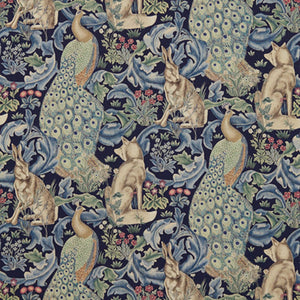 This printed fabric depicts scrolling acanthus leaves, peacocks, hares and foxes amongst bunches of wild flowers, inspired by the Forsest Tapestry by Morris & Co. and designed by Alison Gee in 2013. Digitally printed on velvet and linen for a sumptuous finish with the durability suitable for an upholstery fabric.