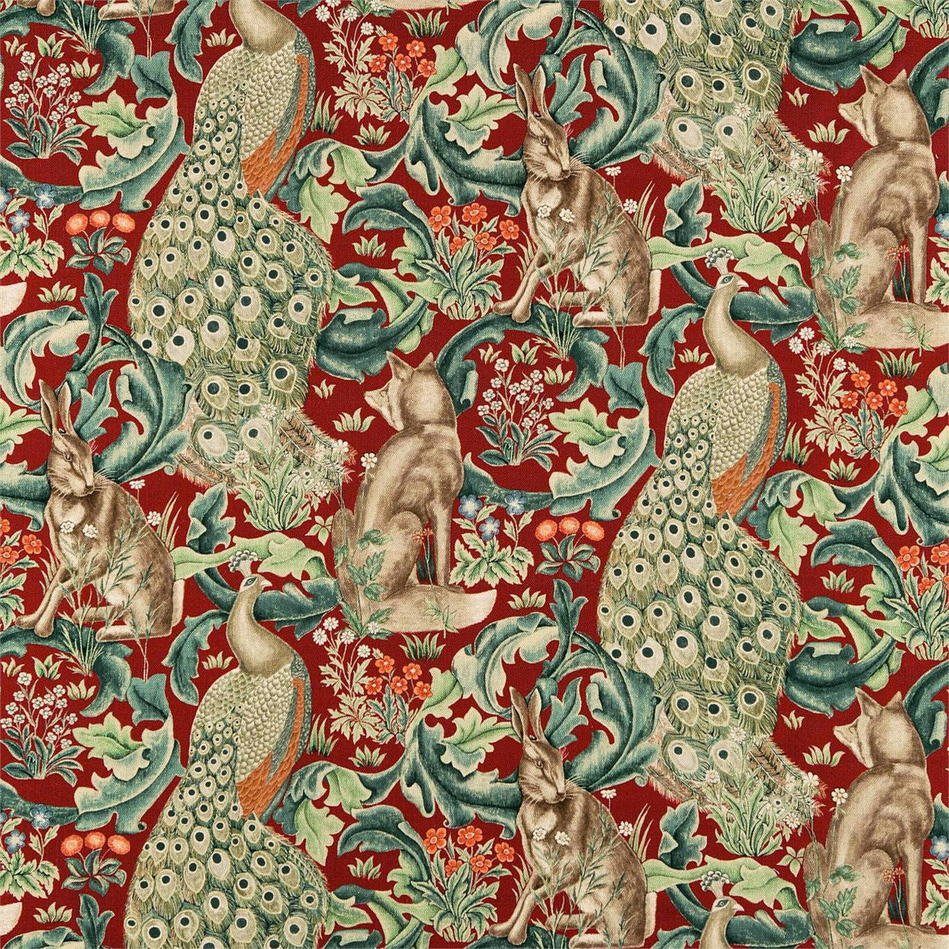Designed by Alison Gee in 2013 this printed fabric depicts scrolling acanthus leaves peacocks hares and foxes amongst bunches of wild flowers digitally printed on velvet and linen for added luxury and inspired by the Forest Tapestry by Morris & Co. Use alongside rich antique wood and painted panelling.