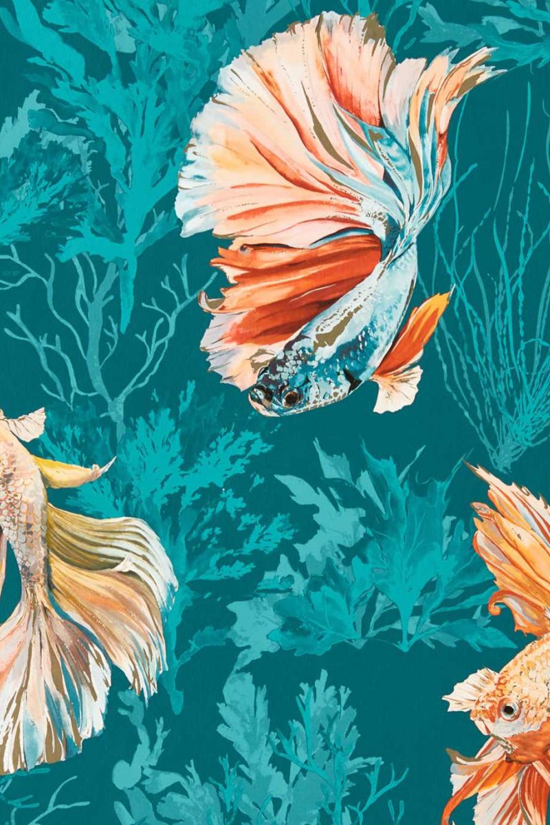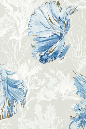 Immerse your space in the serene beauty of the ocean with the Halfmoon wallpaper by Harlequin. This exquisite design features elegant Siamese fighting fish, depicted in stunning shades of blue and white, gliding effortlessly through a sea of muted grey botanicals. The watercolour effect adds a delicate touch, while subtle gold accents bring a hint of opulence to the composition. Perfect for creating a calming retreat, this wallpaper will breathe life and movement into any room.