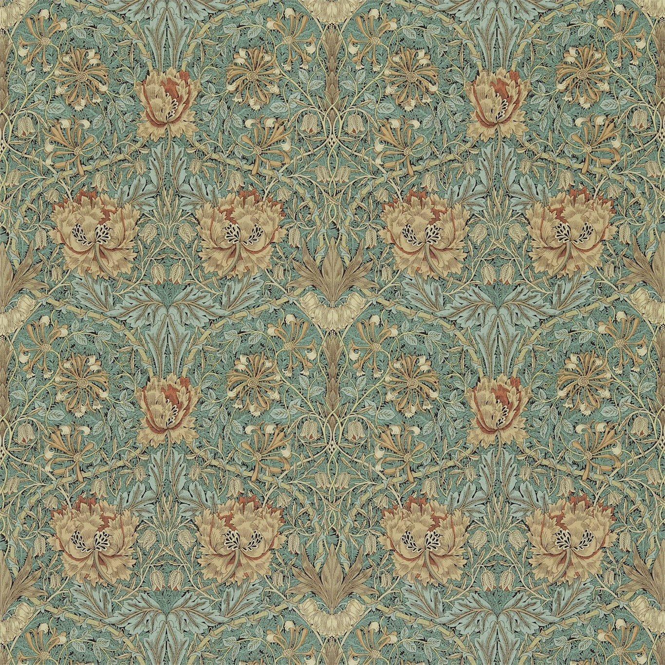 First produced in 1876 Honeysuckle & Tulip was an early Morris fabric design depicting entwined foliage and flower motifs in a mirrored pattern repeat. The effect is of a trellis circling large multi petalled tulips and stylised honeysuckle. Best appreciated in a large expanse this beautiful design comes in a range of stunning colours.