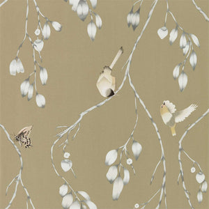 Zapara Wallpapers - Iyanu. This delicate foliage trail wallpaper includes carefully etched butterflies and birds perching on willow-like branches in beguiling colourways. A stunning choice for living rooms. Recommended Paste Harlequin Ready Mixed Tub Paste. Paste the Wall