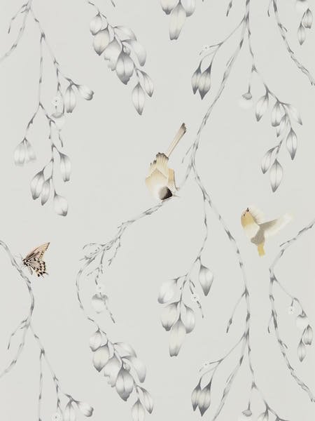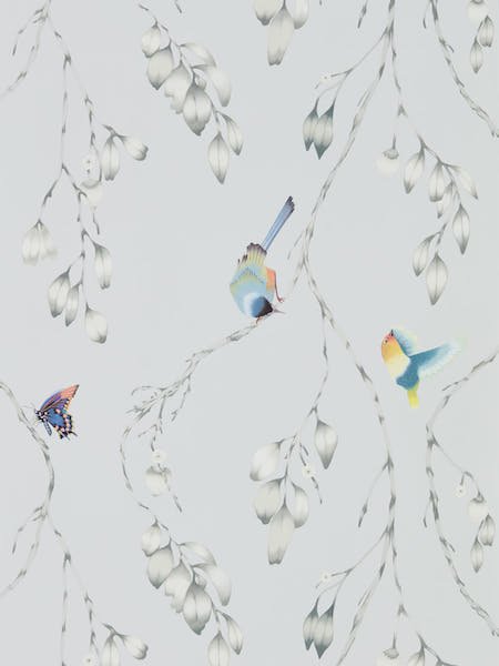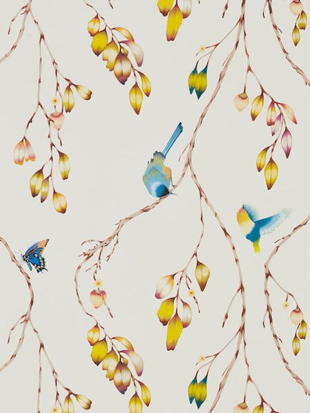 The Iyanu wallpaper by Harlequin features a whimsical design, adorned with delicate twining branches and playful birds. Soft pastel tones harmonise with vibrant splashes of blue and yellow, bringing a gentle yet joyful pop of colour to any room. Each bird is intricately detailed, suggesting movement and life amidst the tumbling foliage. This wallpaper invites the serenity of nature into your home, creating a tranquil and enchanting space.