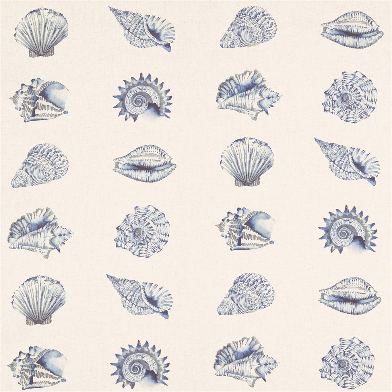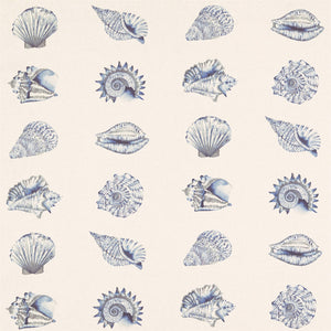 Anthozoa Fabrics - Kabibi. An assortment of watercolour seashells arranged in neat formation on this linen mix fabric. Ideal for introducing a seascape element to your home.