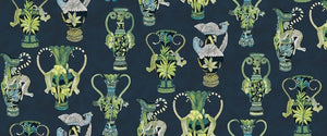 Immerse your space in the whimsical charm of the Khulu Vases wallpaper by Cole & Son. Set against a rich navy backdrop, this design showcases an eclectic array of vases, each brimming with jungles, wildlife, and elaborate botanicals. The lush greens, soft yellows, and hints of white, along with enchanting fauna accents, come together to lend an air of exotic sophistication. This captivating wallpaper breathes life into any room, creating an inviting and playful atmosphere.