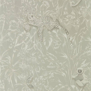 Contrasting against a flat ground, a lounging leopard reclines on his throne of tropical foliage, flanked by a characterful chameleon and an endearing lemur. This amazing piece of artwork was hand painted in the Harlequin studio and displays metallic highlights against a flat contrasting ground. Available in two colourways: Oyster and Slate. Paste the Wall