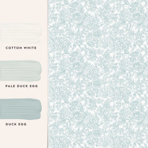 The Louise Wallpaper by Laura Ashley graces interiors with its elegant floral design in a serene duck egg colourway, seamlessly blending classic charm with a contemporary palette. Evocative of English country gardens, the intricate pattern features an array of blooming flowers and leaves, bringing a touch of nature's tranquillity indoors. Its subtle hues of cotton white segue into pale and true duck egg, crafting a fresh and airy ambience perfect for creating a peaceful haven in any room.