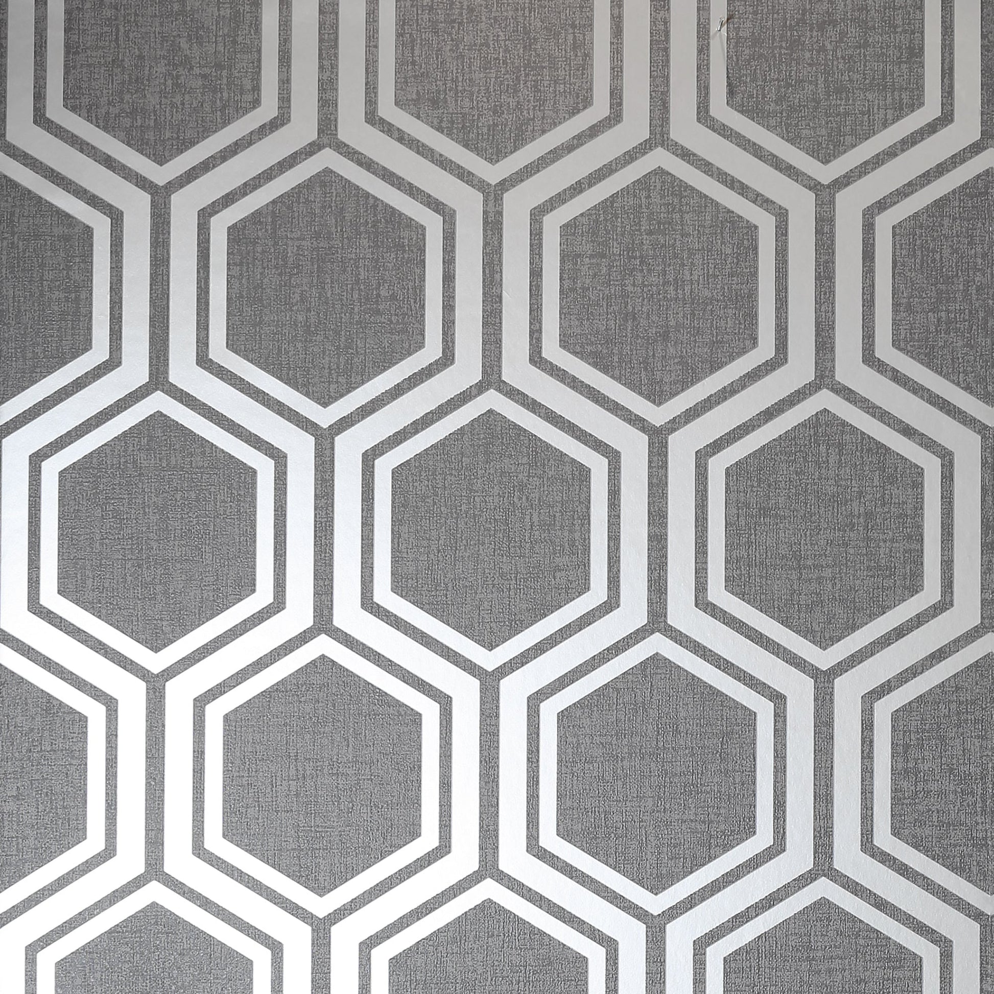 Luxurious and striking, the bold graphic hexagon wallpaper is designed to make a strong style statement. Contrasting a dark grey textured finish with a sleek silver pattern, it's a paper that will create impact - as well as reflecting day light or the glow from lamps back into the room. A blown vinyl paper, that will cover imperfections on your walls, it will add depth and texture to a room. Ideal as a feature wallpaper in a lounge or dining room, it also looks the part in a boutique-hotel style bedroom. Suitable for most rooms except high moisture environments, like bathrooms.