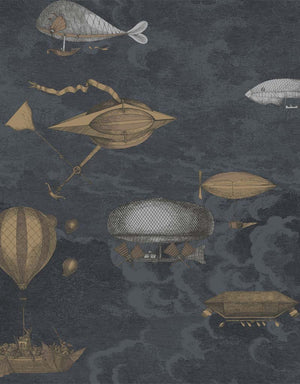 Embrace the spirit of adventure with the Macchine Volanti wallpaper by Cole and Son, a captivating infusion of vintage charm and whimsical elegance. Adorning your walls in a captivating navy colourway, this exquisite design features an array of fantastical flying machines drifting gracefully across a softly textured background. The intricate details of the sepia-toned airships and balloons interplay with the depth of the midnight-hued canvas, crafting an immersive aerial spectacle that promises to transform any room into a scene from a bygone era of exploration and imagination.