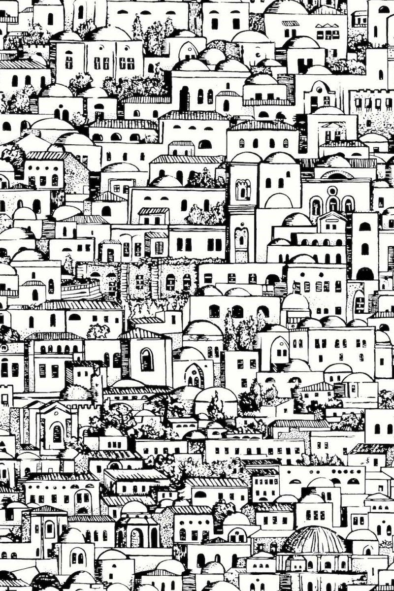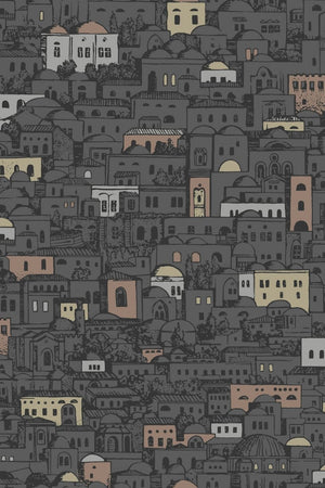 The Mediterranea wallpaper by Cole & Son captures the essence of a quaint coastal town with its eclectic array of buildings, depicted in a charming colourway of muted greys, accented with warm peach and sandy tones. Every glance reveals new intricacies within its bustling village scene, offering a rich tapestry of architecture that engages the imagination. This design masterfully balances detail with subtlety, making it a versatile choice for both contemporary and traditional interiors.