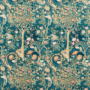 This beautifully printed design of birds and flowerheads trailing a central fruit tree was inspired by a version of the Kelmscott Manor bed hangings crafted for Melsetter House in Scotland. Now translated into a print this new design by Morris & Co. has been painted to create a fresco effect that represents the colourways of the Orkney landscape. Available in three colourways: Indigo Linen and Grey
