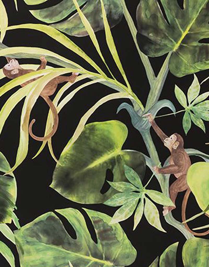 Immerse your space in the tropical charm of Monkey Business by Clarke and Clarke. This vibrant fabric features a playful ensemble of monkeys amidst a lush array of green foliage, set against a dramatic black backdrop that accentuates the vivid greens and natural tones. The delightful depiction of monkey antics offers a touch of whimsy, while the high-contrast colourway provides a contemporary edge. Perfect for adding an exotic flair to any interior, this design promises to enchant and inspire.
