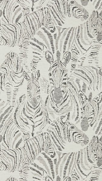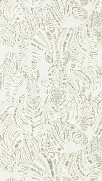 Adorn your walls with the enchanting Nirmala wallpaper by Harlequin, presenting a captivating colourway of soft beige and muted greys. This design features an intricate pattern of zebras, their stripes merging seamlessly with delicate foliage to create a harmonious blend of the wild and the botanical. This elegant wall covering is a subtle nod to the beauty of the natural world, perfect for adding a touch of serenity and sophistication to any interior space.