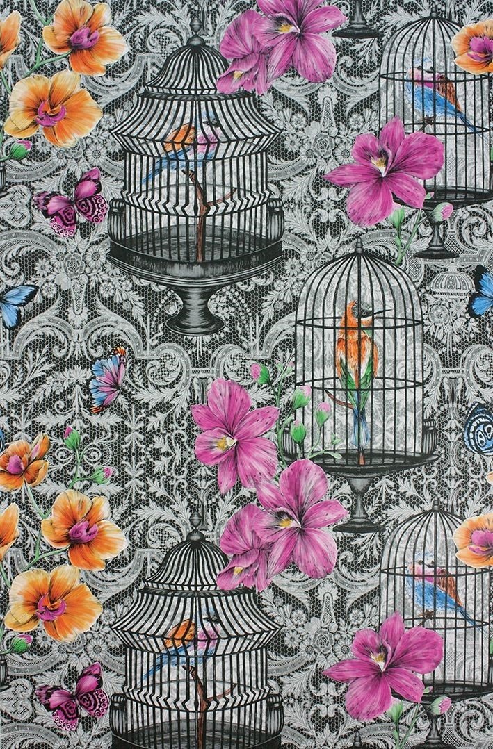 Imbue your space with the exotic elegance of the Orangery wallpaper by Matthew Williamson. This stunning design presents an intricate grey backdrop, lavished with vivid floral motifs in shades of pink, purple, and orange. Delicate butterflies add a touch of whimsy, while ornate birdcages housing colourful birds lend a classic yet playful charm. Perfect for creating a statement wall, this wallpaper combines the grace of nature with artful sophistication to transform your interior into an enchanting haven.