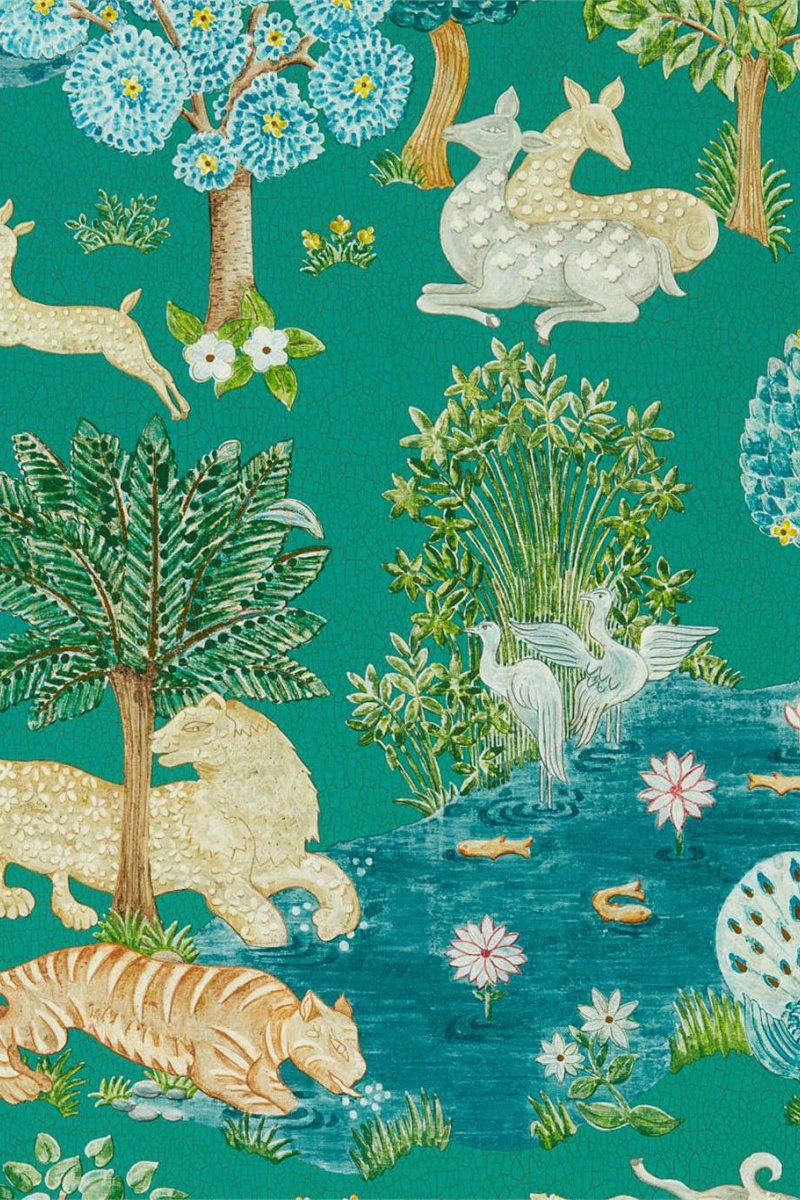 Immerse yourself in the enchanting expanse of Pamir Garden, a captivating design flourishing with the vibrance of nature's elegance. Set against a rich teal backdrop, this sumptuous fabric blossoms with hues of azure, cream, and touches of soft gold, echoing the serenity of an oriental oasis. Each stroke reveals expertly illustrated wildlife, from the graceful majesty of tigers to the serene poise of cranes, woven amidst a tapestry of lush flora and fauna. A piece that promises to transform your space with its timeless allure and tranquil beauty.